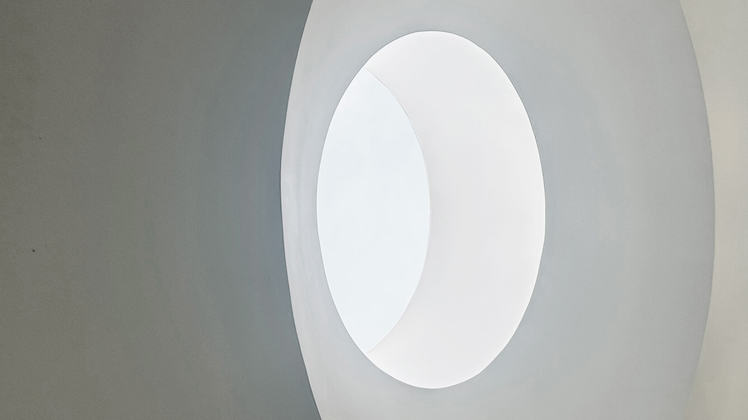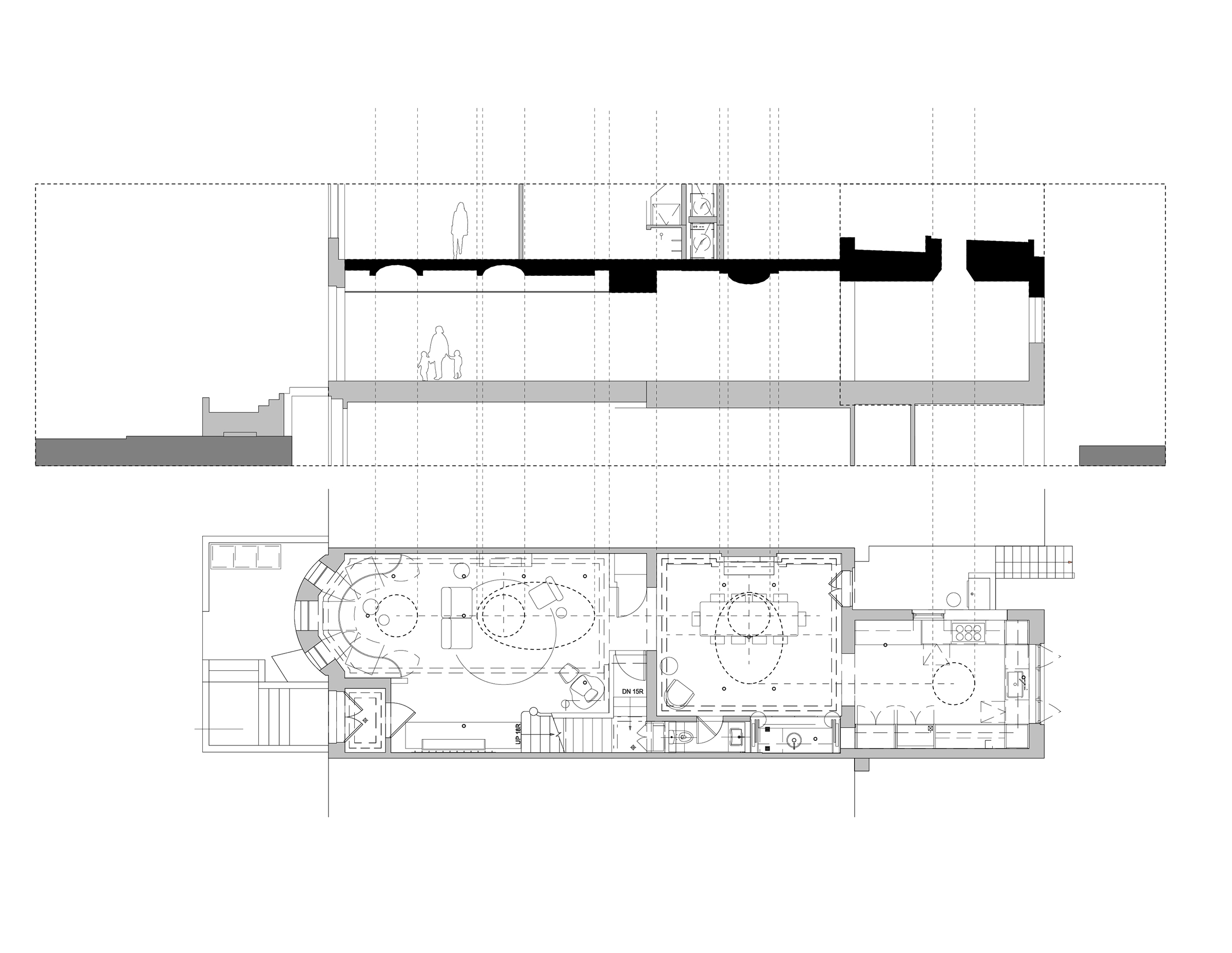 A new circular skylight in the kitchen sits in dialogue with historic ceiling details in adjacent parlor-level rooms.