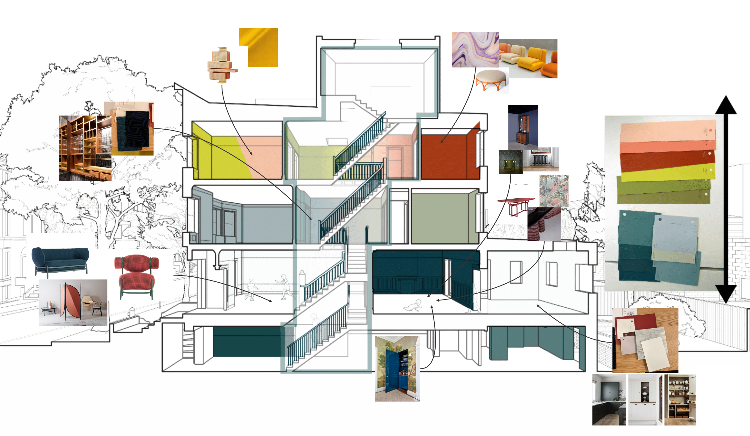 A quiet, lush palette of hues brings distinction to each space, from a home office in the lower level all the way up to the kids’ bedrooms on the fourth floor.